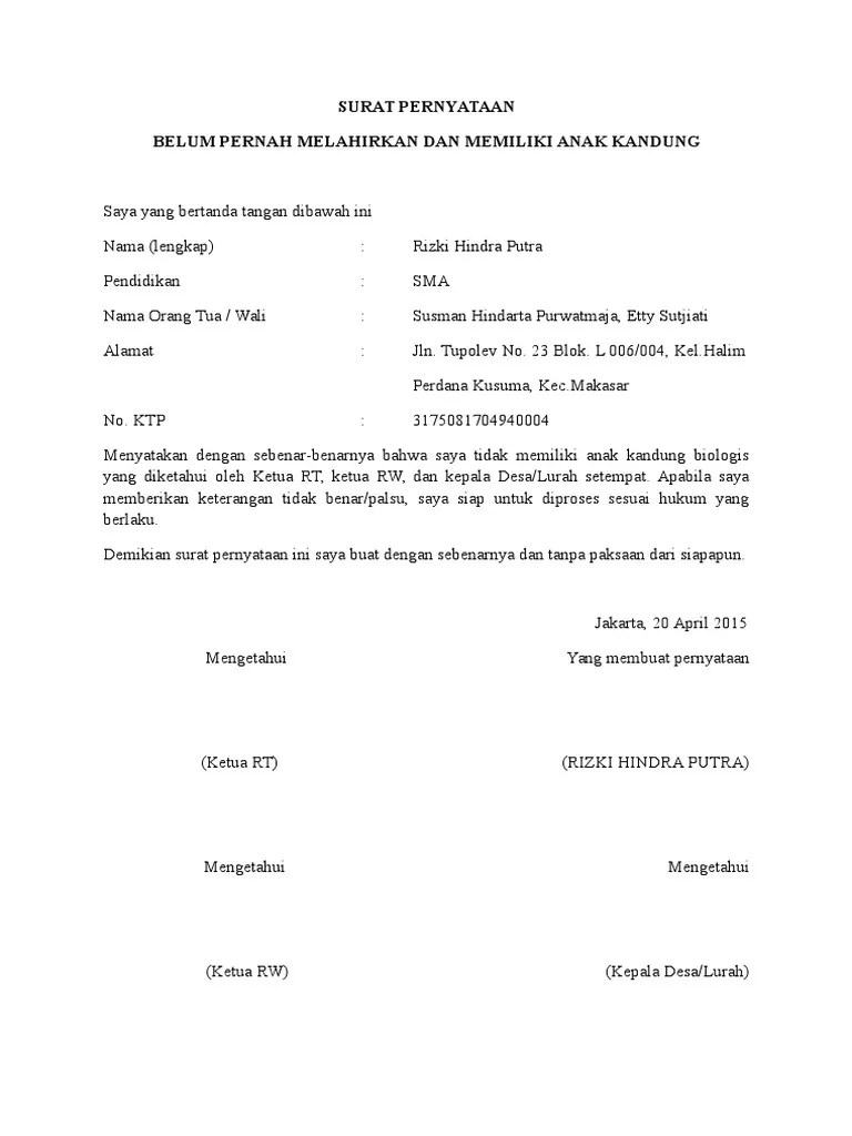 Surat ini dapat dibuat oleh ketua rt, . Surat pernyataan belum menikah berisi keterangan bahwa si pembuat surat memang. Apakah anda mencari contoh format surat keterangan belum menikah dari ketua rt doc (word) maupun pdf terbaru? Berikut file dalam bentuk ms word, jika ingin download silahkan klik pada . Contoh surat pernyataan belum menikah ketika seseorang hendak melamar.